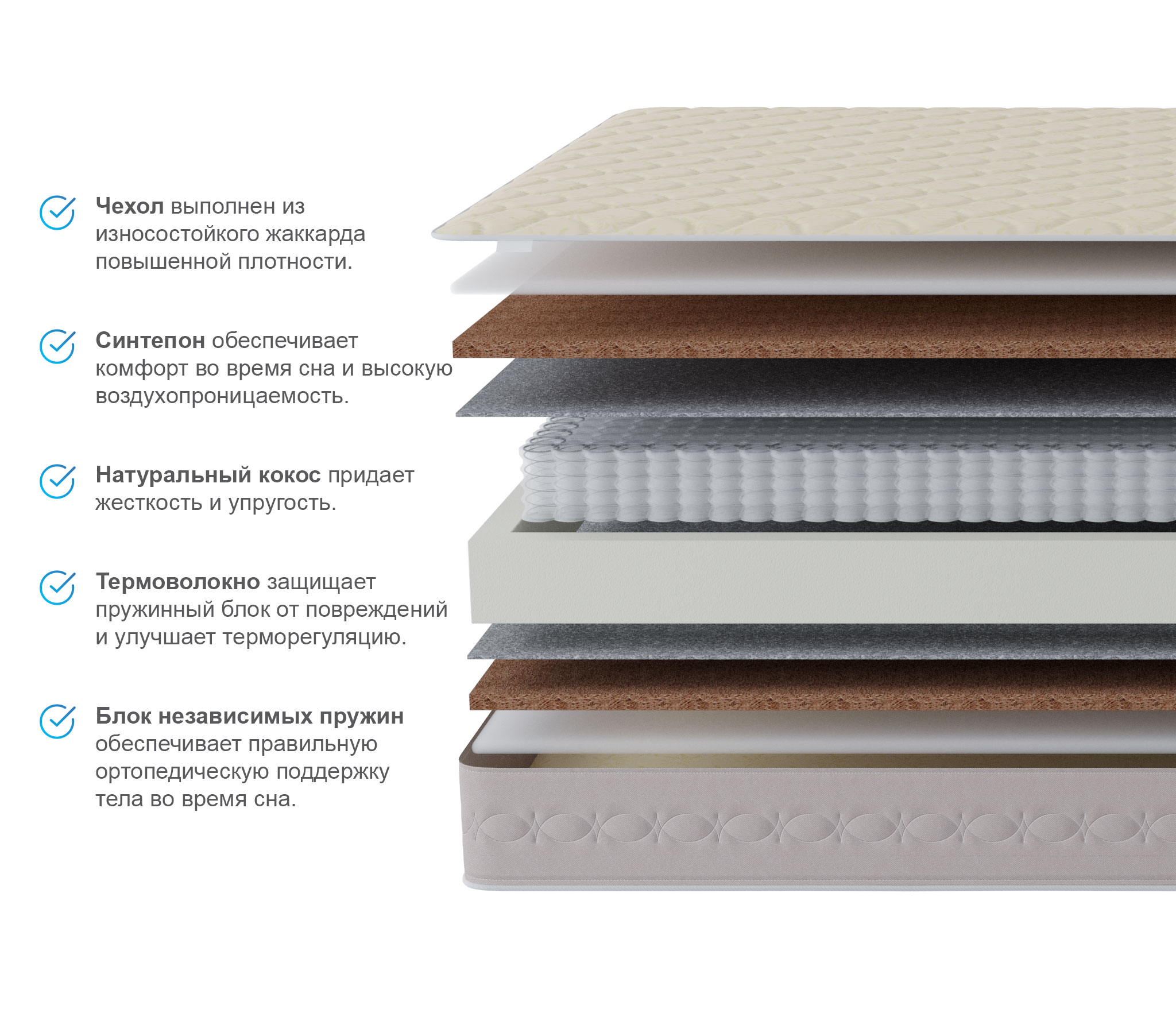 Основу матраса по недорогой цене составляет независимая пружинная система. Именно благодаря такому решению изделие: