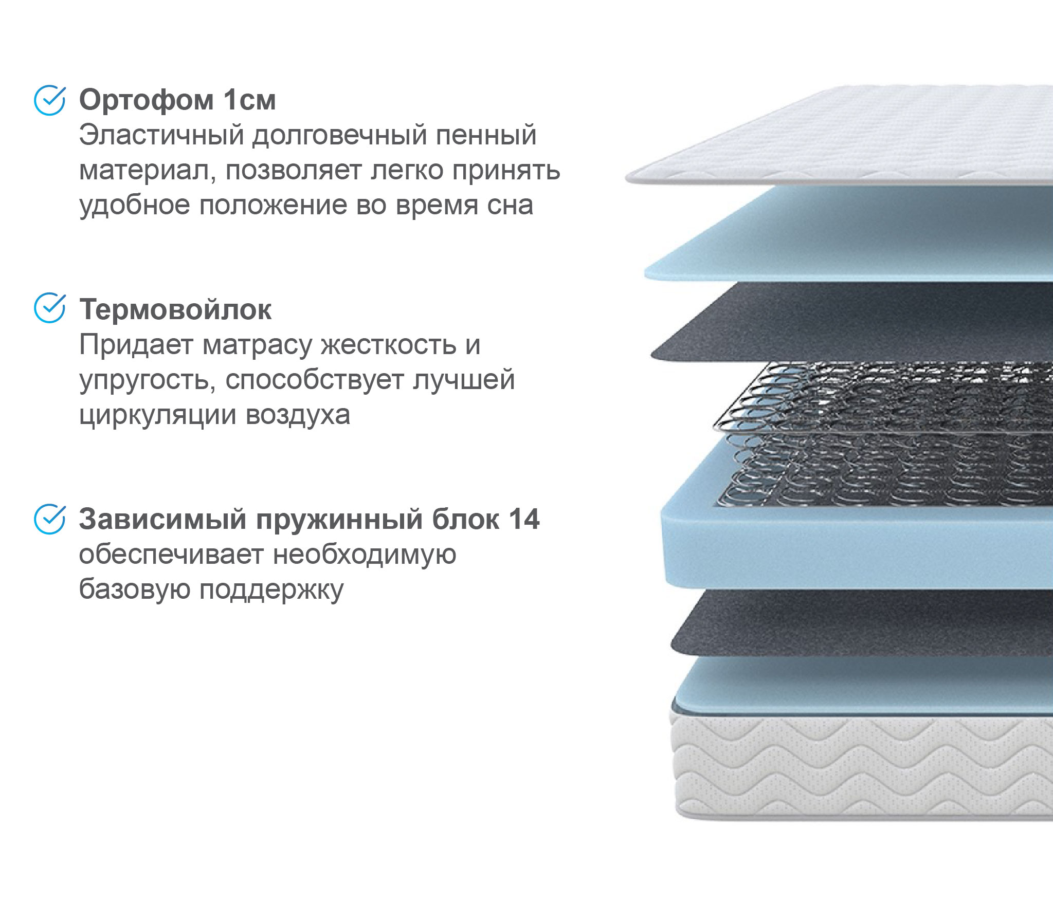 Основой служит зависимый пружинный блок Боннель. В нем все конусные стальные пружинки (126/м2) соединены между собой и скреплены при помощи специальной рамы. Изделие способно выдерживать высокие нагрузки. Над блоком в 1см расположена латексированная кокосовая койра. Это покрытие на основе жестких кокосовых волокон, но смягченных натуральным латексом. Наполнитель улучшит осанку, поддержит корсет из мышечной ткани.